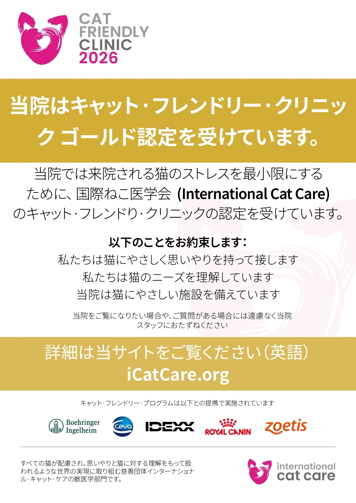 猫医学の発展やより猫に優しい動物病院作りを目指す者たちの団体が、認定プログラムを実施しています。